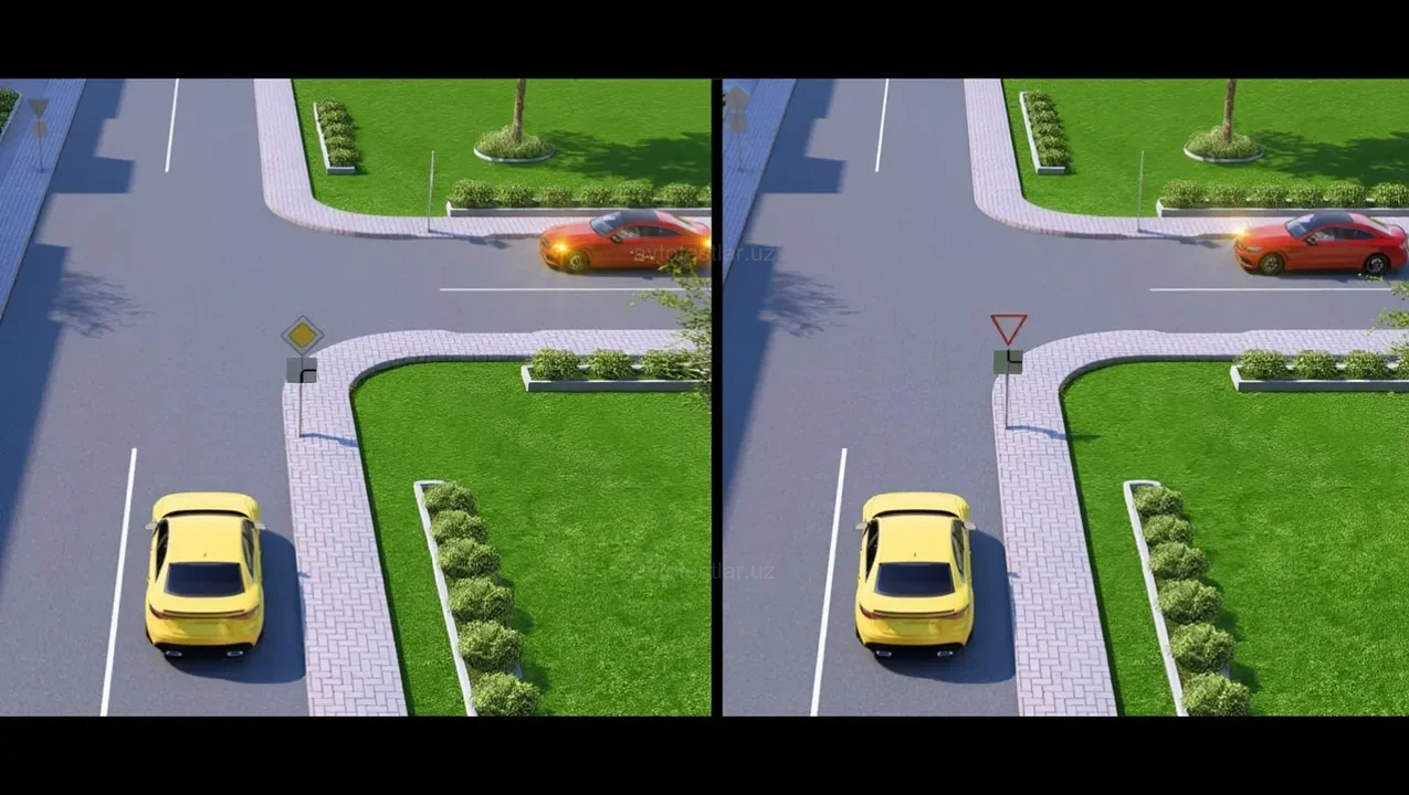 На каком рисунке водитель жёлтого автомобиля должен уступить дорогу красному автомобилю?