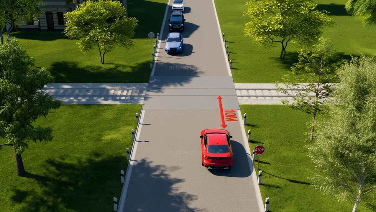 Водитель красного автомобиля правильно ли остановился, чтобы пропустить приближающийся поезд?