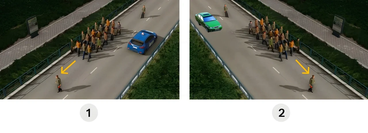 На каком изображении организованная группа пешеходов движется по проезжей части, не нарушая правила?