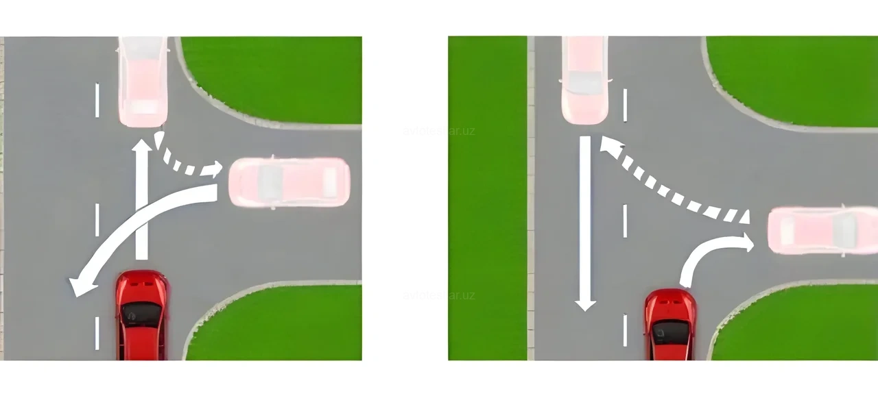 Способ разворота с использованием прилегающей территории справа, обеспечивающий безопасность движения, показан