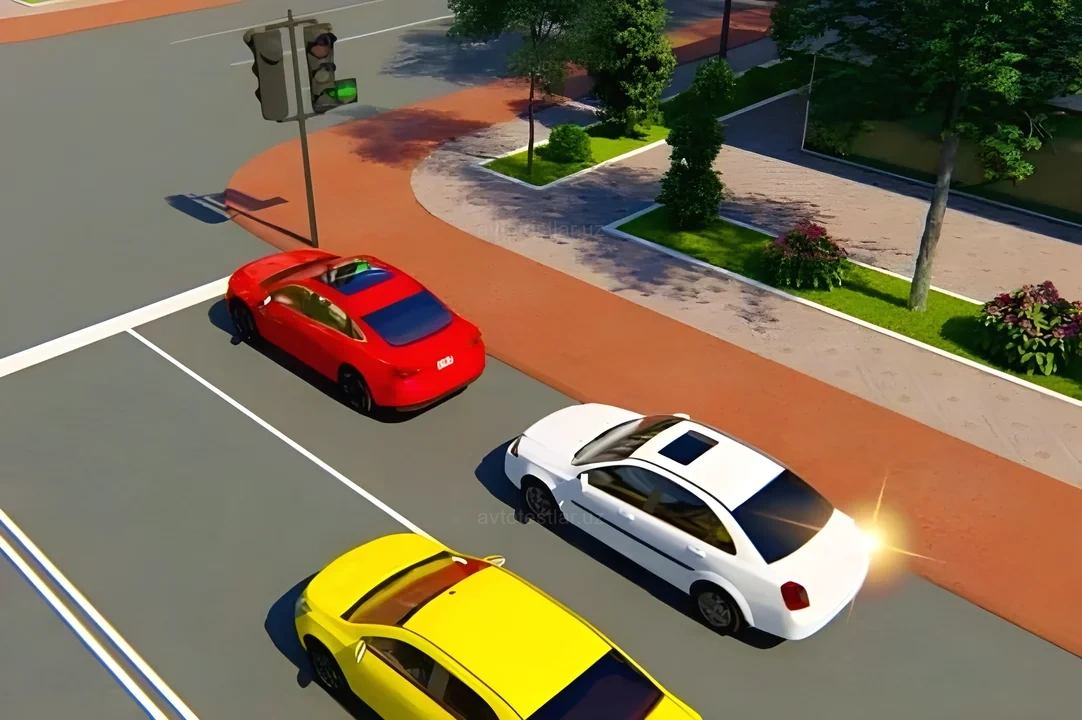 Как должен поступить водитель красного автомобиля в ситуации показанной на рисунке?