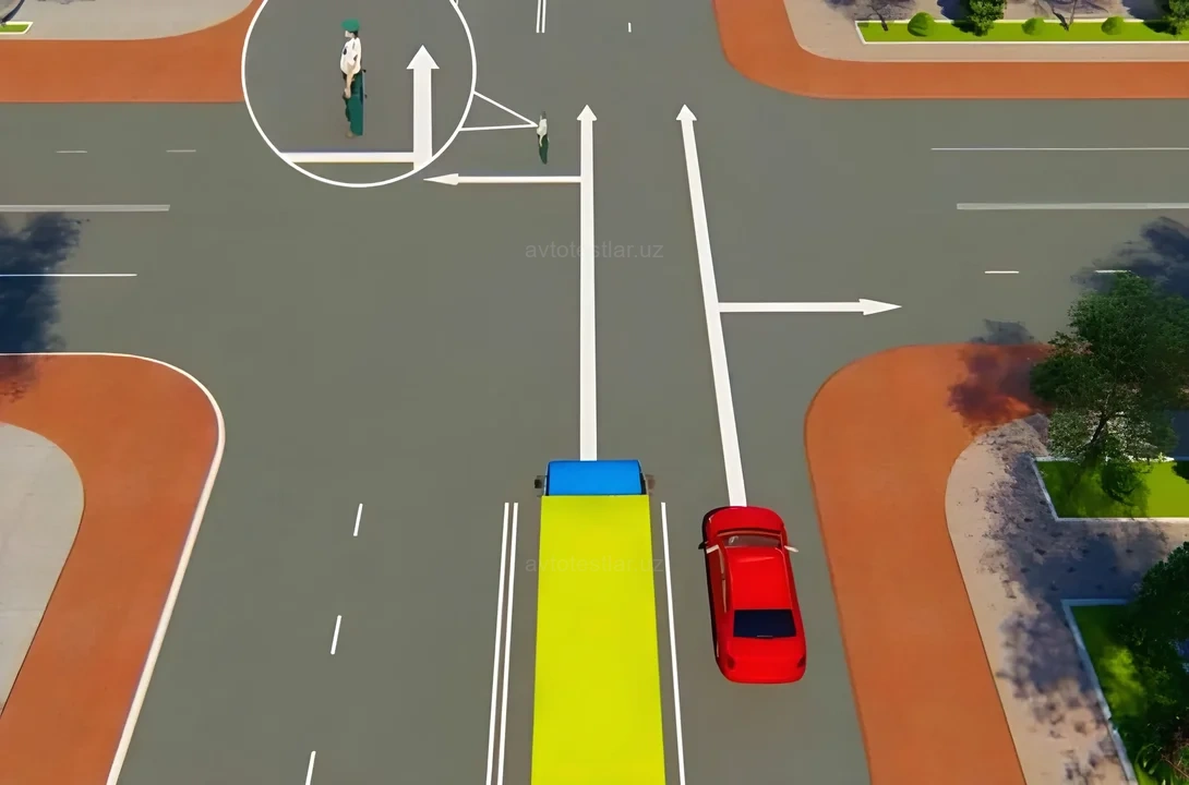 AСине-желтому автомобилю - прямо, красному автомобилю — прямо и направо