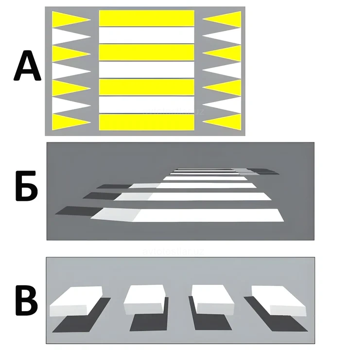 Qaysi yotiq yo'l chizig'i avtomobil yo'llarida 3D kurinishidagi baland piyodalar utish joyini bildiradi?