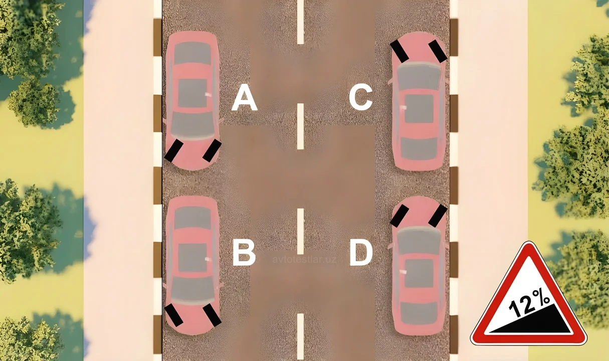 Balandlikda yo'l chetida to'siq mavjud bo'lganda to'xtagan avtomobilni joyidan g'ildirab ketishini oldini olish uchun oldingi g'ildiraklarni burib qo'yish usuli qaysi javobda to'g'ri ko'rsatilgan: