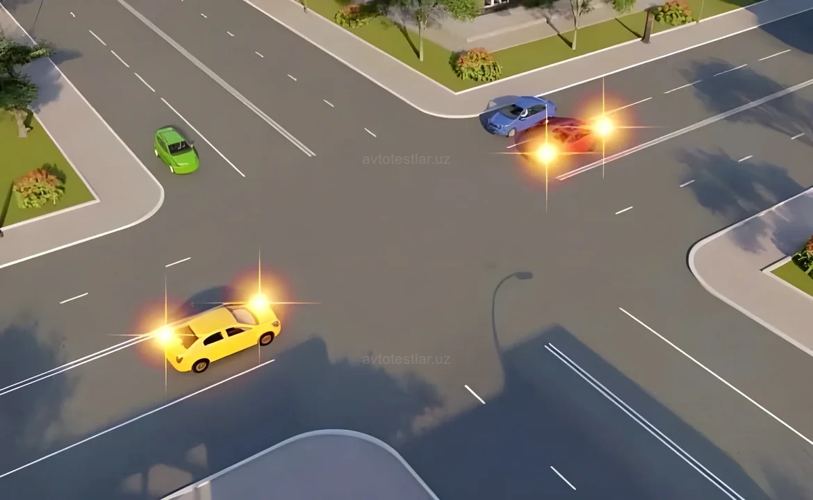 BSariq avtomobil chorrahaga kirib keladi va ko'kni o'tkazib yuborish uchun to'xtaydi; yashil; ko'k, qizil bilan bir vaqtda; sariq