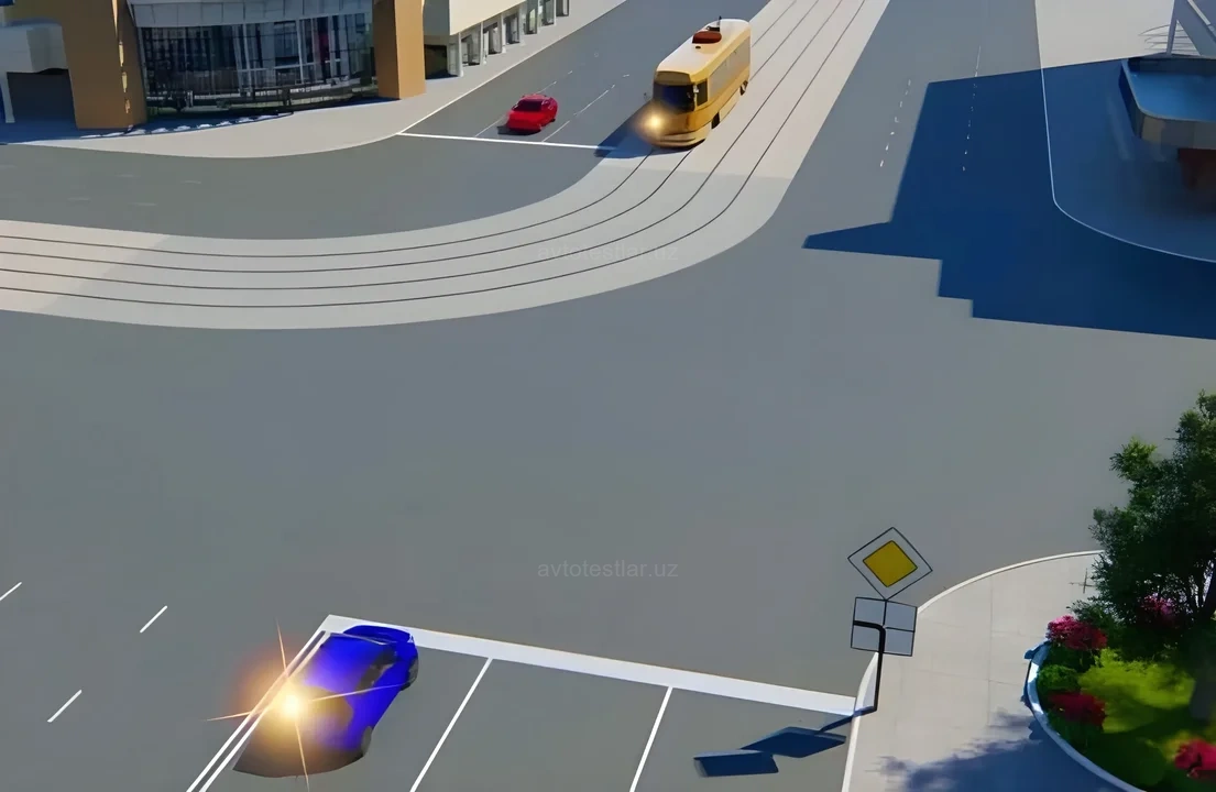 BTramvay, ko'k avtomobil chorrahaga chiqadi, qizilga yo'l beradi, so'ngra burilishni tugallaydi